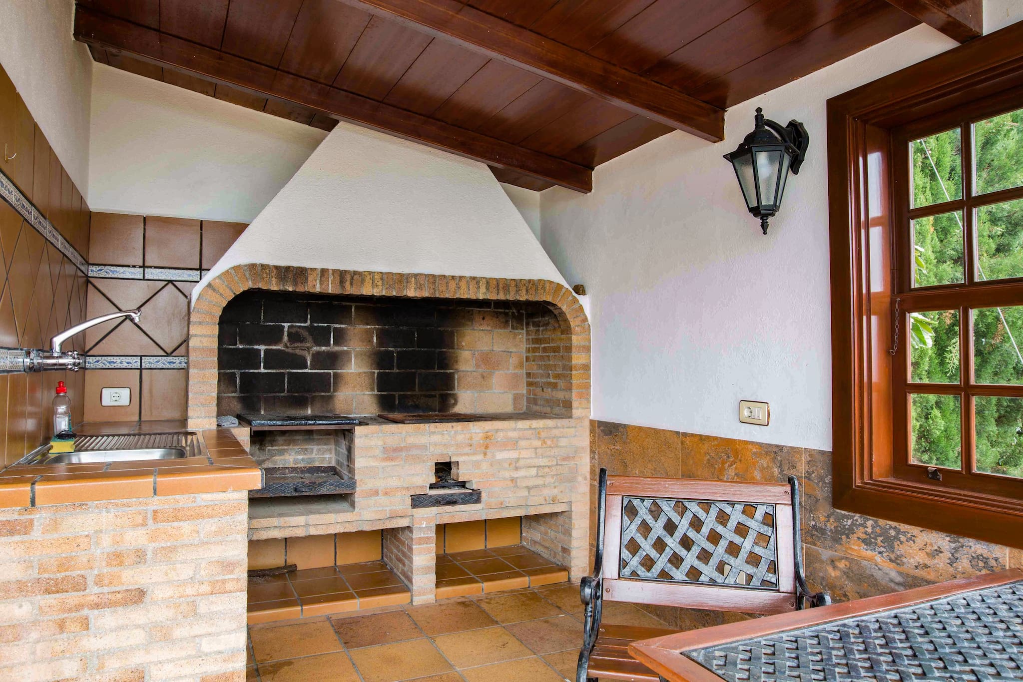 Leaving the kitchen we find the barbecue area that is open to the outside. At the main entrance, there is a cosy covered terrace and in front of the house, there is a large solarium terrace with sun loungers to enjoy sunny days and the beautiful and quiet environment in which the house is located.
